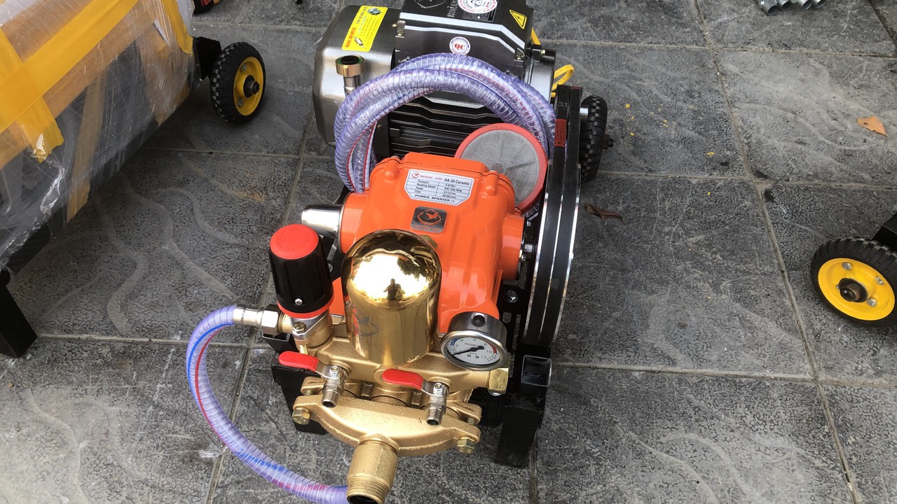 Phụ kiện: Dây áp lực 15m, dây hút, dây hồi, lọc rác, bộ zoăng phớt sơ cua, bộ cần bép phun.